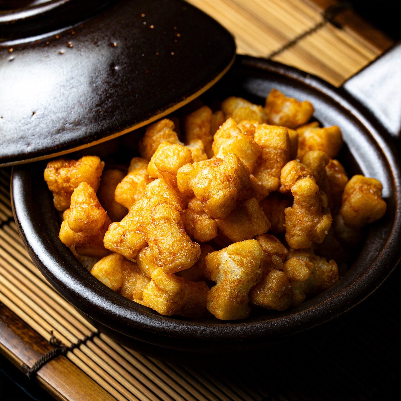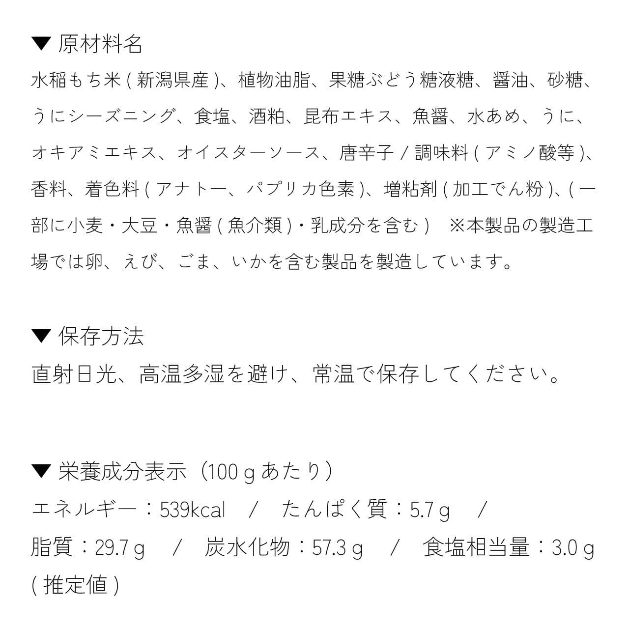 新潟産のもち米「わたぼうし」をその日使う分だけ精米して製造。職人のこだわりと丁寧な仕事ぶりがうかがえます。さらにオキアミや魚醤を加えることで引き出された旨味は、奥行きのある濃厚な風味。醤油の香りともち米の自然な甘みが重なり合い、醤油単体の米菓とはひと味違った深い旨みが広がります。お茶請けや日本酒、焼酎などの和酒、ビールのおつまみにも喜ばれる逸品です。