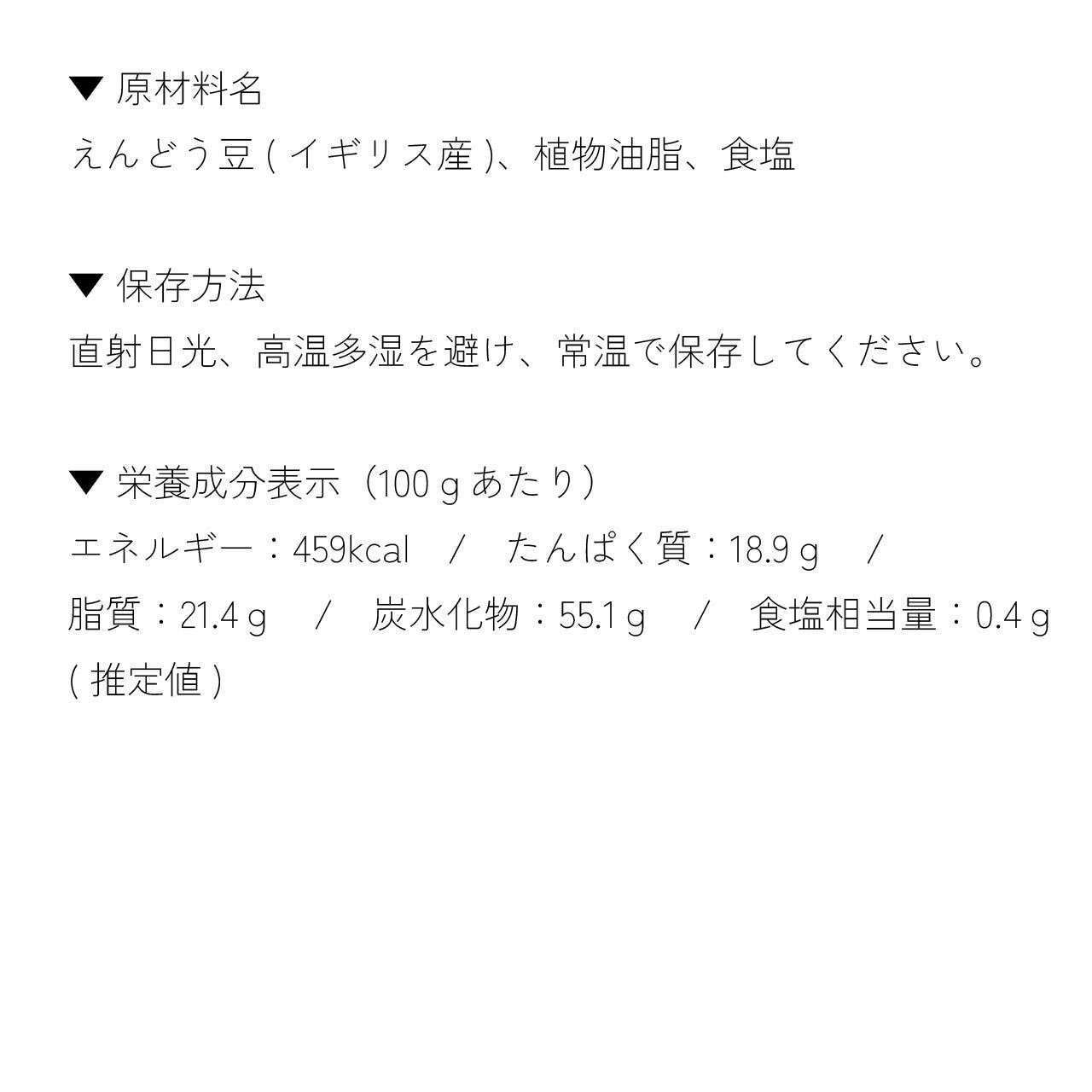 着色料不使用、味付けは食塩のみ。自然本来の風合いと味わいです。キレイ過ぎる豆に違和感がある方、健康を気遣う方のおつまみ、お子様のおやつにお勧めです。バーテンダーの方々にも使っていただいているプロの舌も認めるおつまみです!※着色していないため、紫外線で変色する場合があります。太陽光や蛍光灯などの光を避けて保存してください。