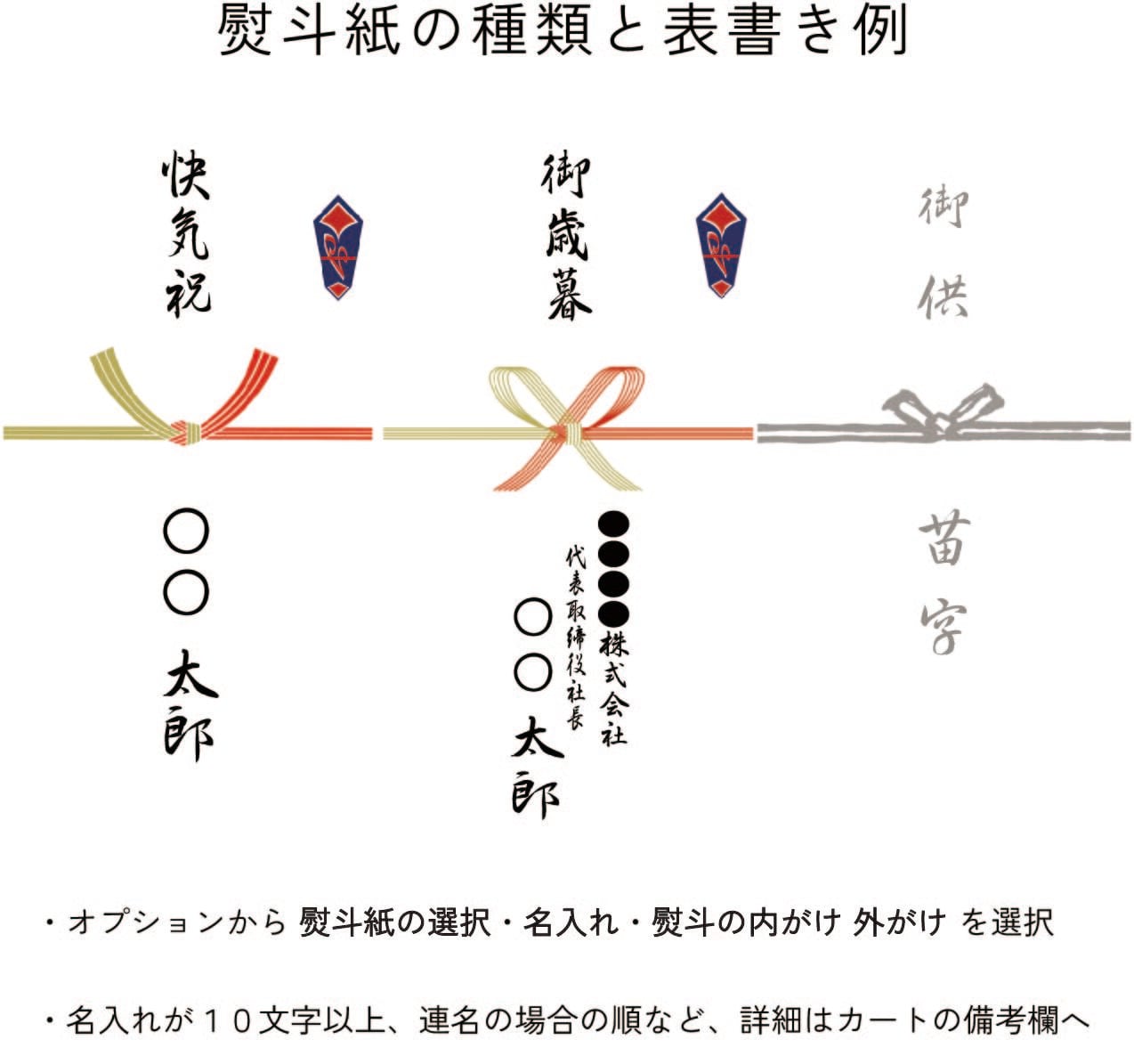 ●オプションで熨斗紙の選択、名入れ、熨斗の内がけ、外がけを選択してください。