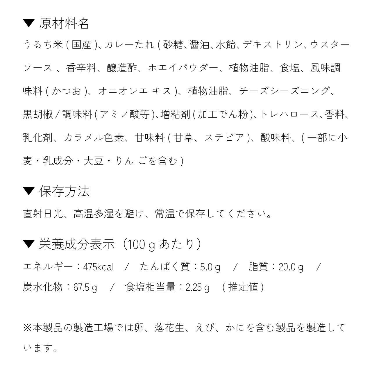 国産のうるち米を使用したせんべいを、複数のスパイスを調合した独自開発のコク深い和風カレーだれに漬け込み、揚せんべいに仕上げました。マイルドなゴーダチーズとコクのあるチェダーチーズの2種類のチーズシーズニングが加わることで、スパイシーさの中にまろやかさをプラス。濃厚な和風カレーの味わいが、ビールやハイボール、サワーなどと好相性で、おつまみとしても食べ応えのあるおかきです。辛さも程ほどなのでお子様のおやつにもおすすめです。