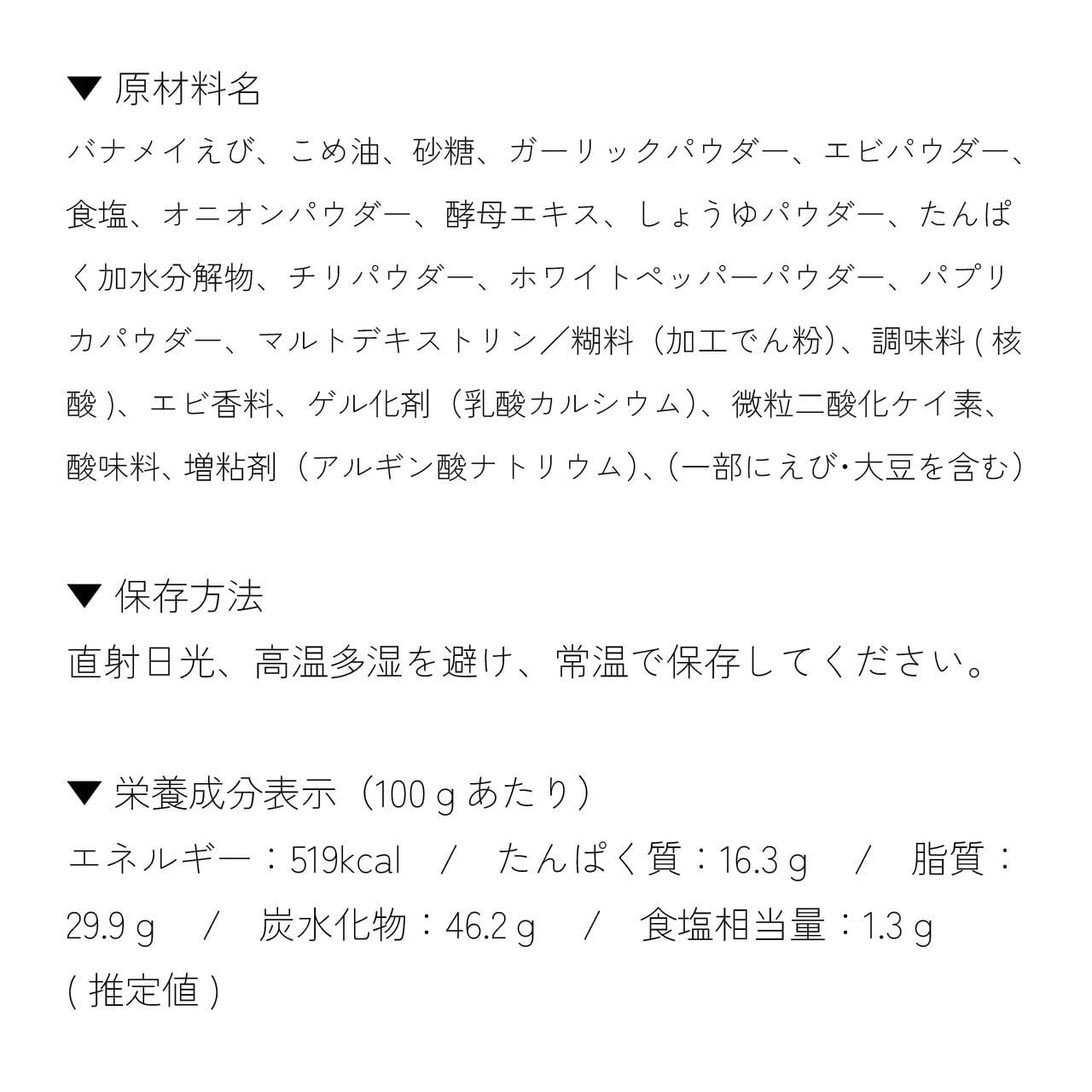 海老の頭部だけをカリカリに揚げて、スナック感覚でつまめる香ばしいおつまみに仕上げました。味付けにはガーリック、オニオン、各種スパイスパウダーを使用し、ほんのりと甘みも効かせた隠し味がポイント。塩味や胡椒だけでは表現しきれない、どこかエスニックな異国情緒を思わせるニュアンスがクセになる味わいです。