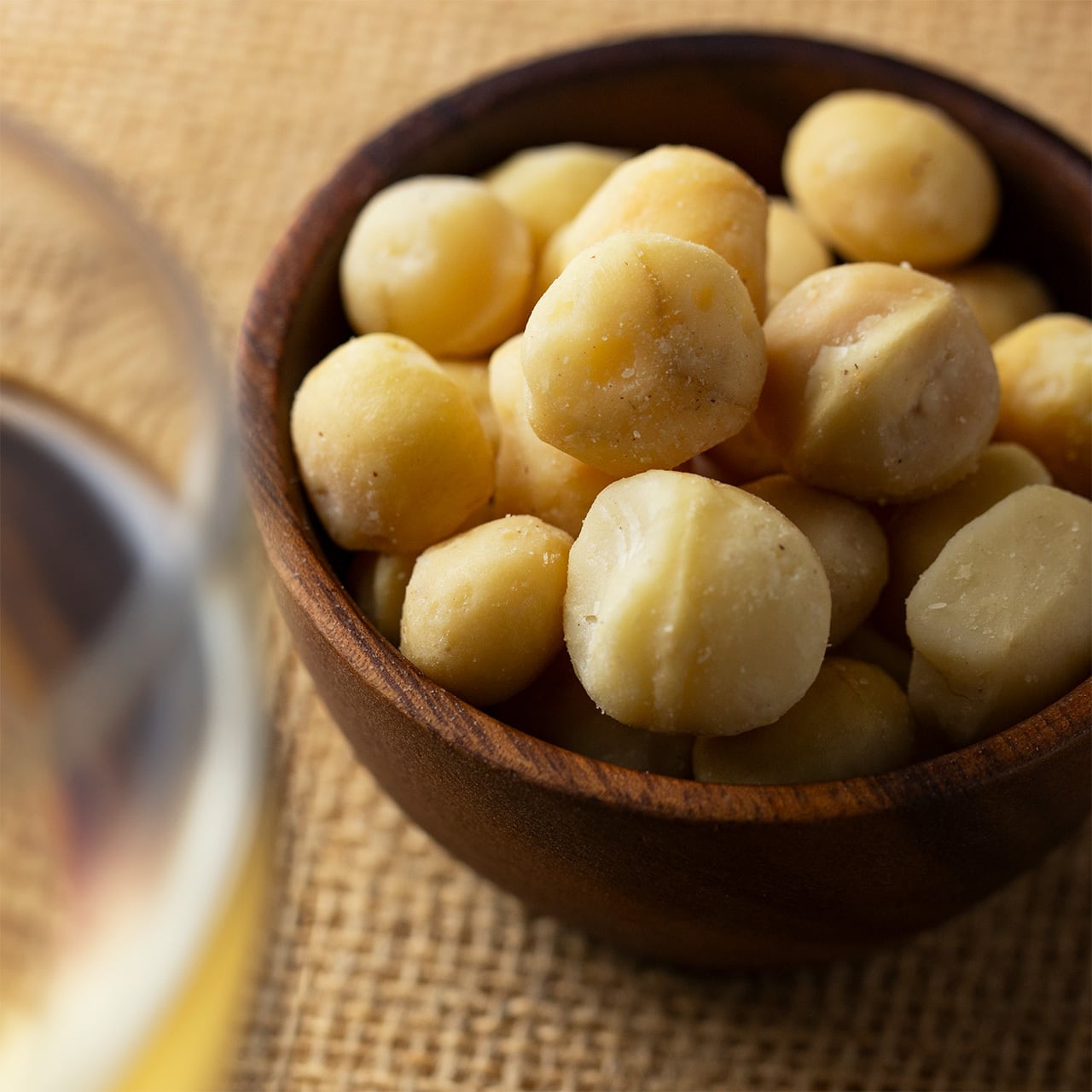 高品質で知られるオーストラリア産の中でも等級の高い選り抜きのマカデミアナッツです。油脂成分をより豊富に含むためバターにも例えられるクリーミーな風味がより一層強く感じられ、味付けが少量の塩のみとは思えない程の濃厚な味わいが楽しめます。