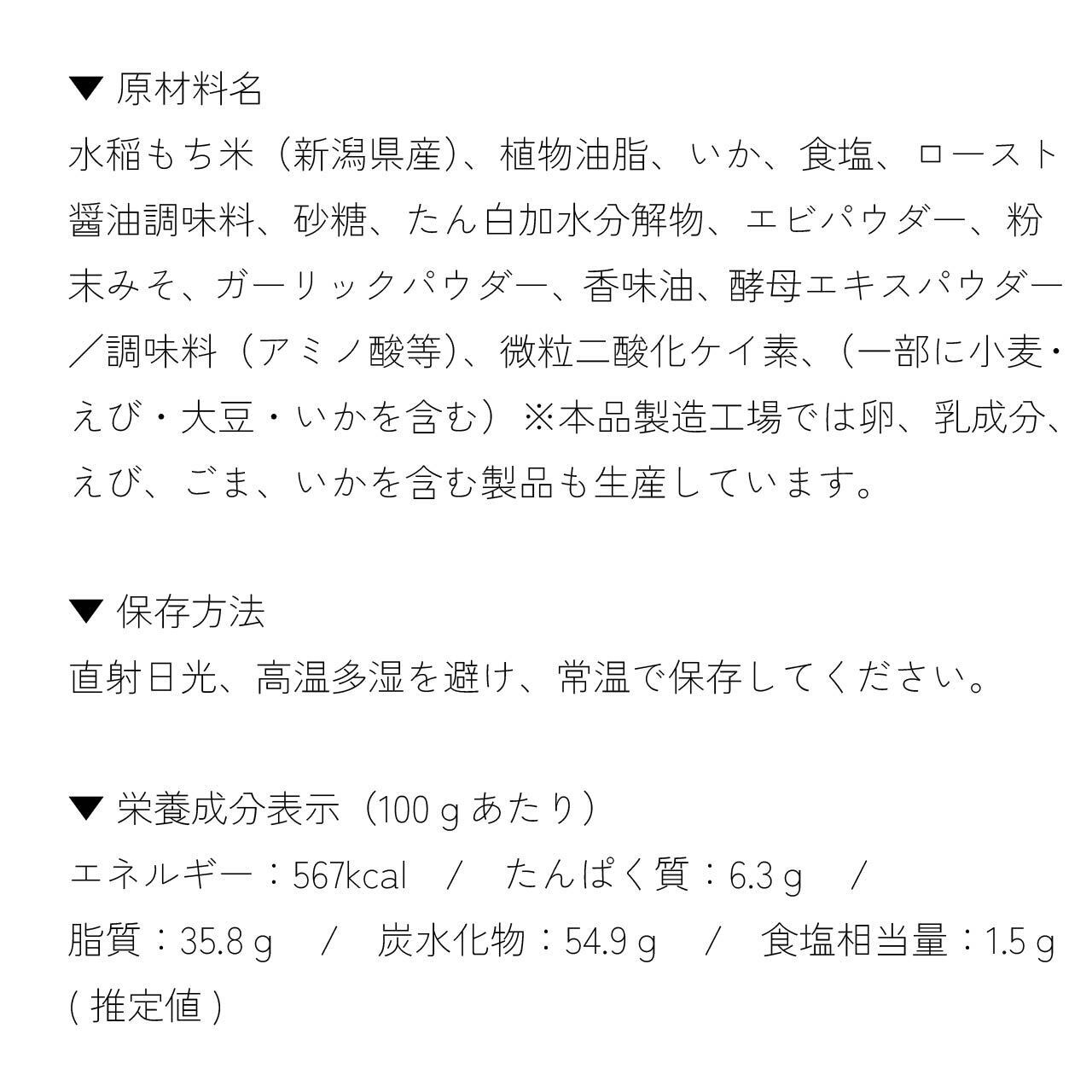 希少になりつつある国産するめいかを生地に練り込み、イカパウダーとガーリックパウダーをまぶしました。さらに焦がし醤油も加え、見た目からは想像できないほどガツンと濃厚な味わいに!ビールやハイボール以外にも辛口日本酒のおつまみとしても人気の一品です。