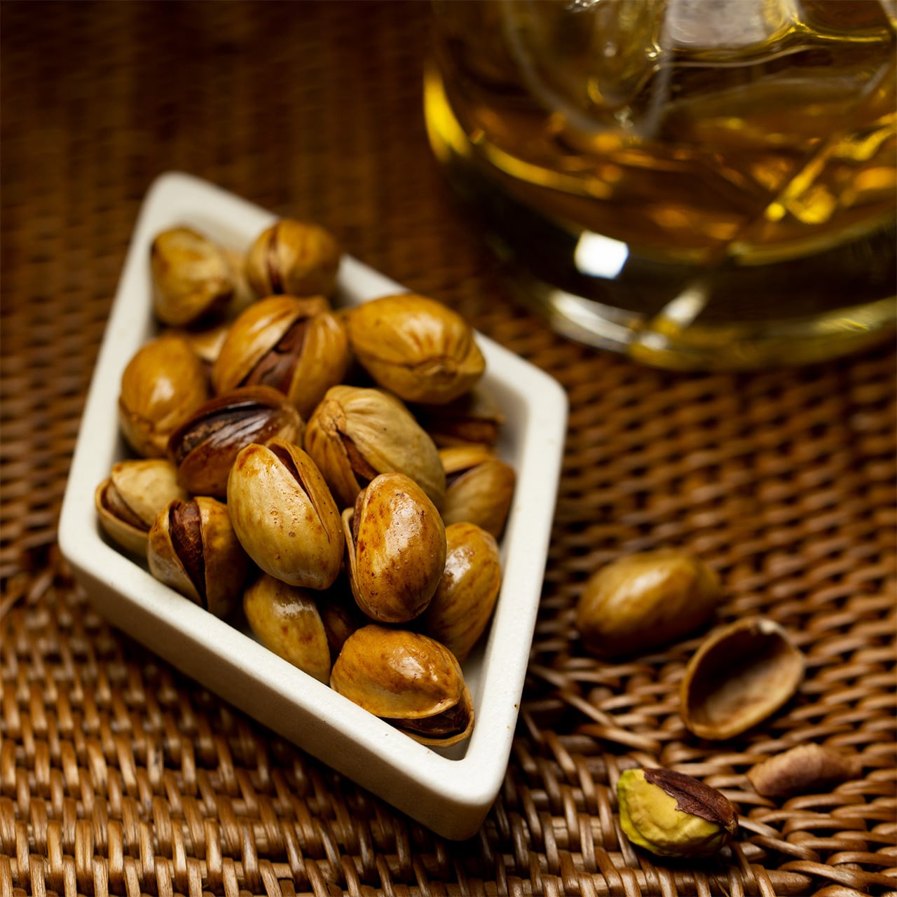 やや小粒ながら濃厚な味わいと香ばしさが強く、プロの料理人やパティシエも好んで使用するピスタチオ発祥の地、本場イラン産を使用。これを長年の役目を終えたウィスキーの熟成樽を粉砕したチップで燻製に。樽由来の微かな甘い香りとタンニンの渋みがナッツに染み込み、加熱による水分の減少で風味が凝縮され、ウィスキーなどの洋酒と相性抜群なのはもちろん、ビールや赤ワインのおつまみにもぴったりです。