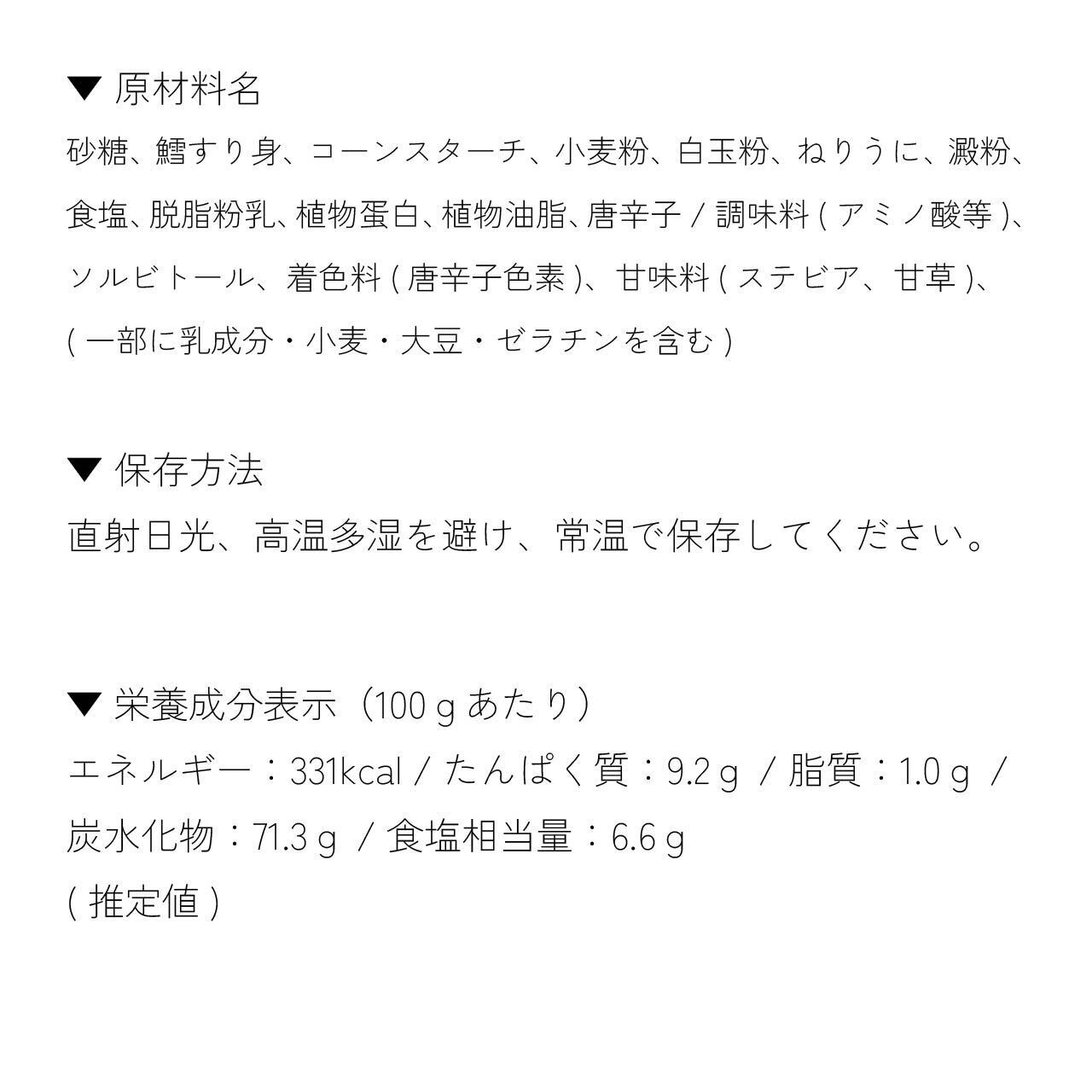 昭和のおつまみ史にその名を刻む超ロングセラー!後に「チーズ鱈」のヒントになった知る人ぞ知る海産高級珍味です。何とも言えない歯応えとほんのり続くうに風味、香ばしい鱈と隠し味程度の甘味がクセになります。また、松の葉の形状に例え、年中枯れない松は生命力を象徴し、枯れ落ちたとしても2本1対のまま離れない事から大変縁起が良いとされています。紅白の色味も好まれ、参拝者にお神酒と供されたり、神前結婚式や地鎮祭、上棟式、直会(なおらい)で供える神饌(御饌、御食、みけ)としても重宝され、全国の神社様でもお使いいただいています。