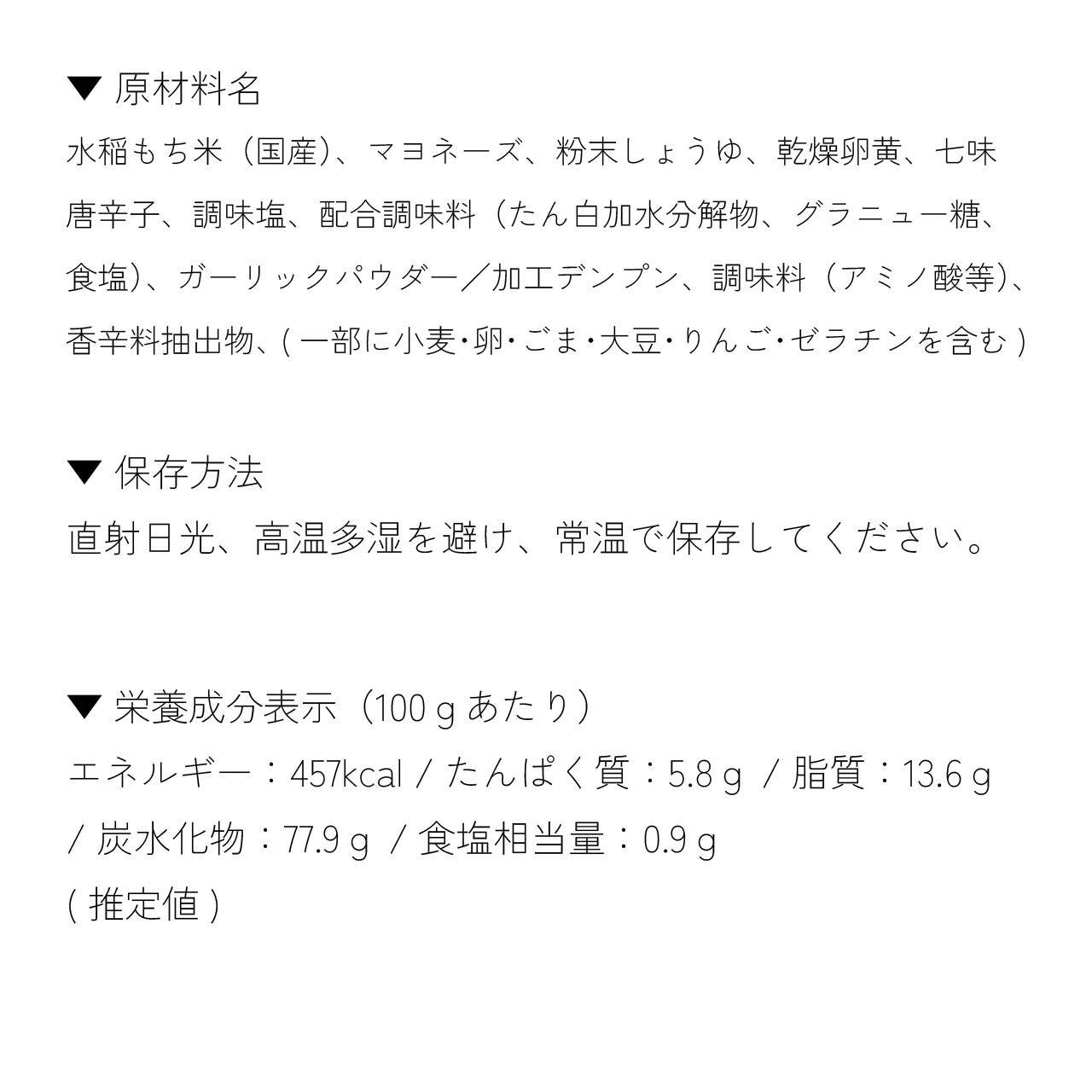ビールの工場見学最後のお楽しみ、試飲コーナー。その際に、少しでも美味しく飲んでもらいたい!そんなビールのプロ達に採用された経歴を持つおつまみ米菓です!国産もち米を使用し、やや堅焼きのあられに醤油とマヨネーズ、控えめに七味を効かせた味付け。ひと口サイズで食べやすく、淡い醤油味にあっさり目に抑えたマヨネーズが相まって香ばしさが強調され、お酒がすすむ味わいです。濃すぎない絶妙な味付けはお茶請けにもおすすめです!
