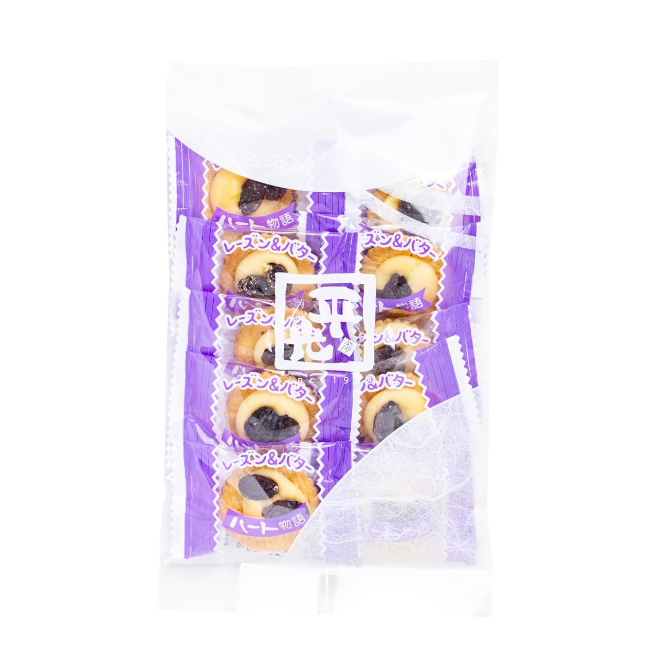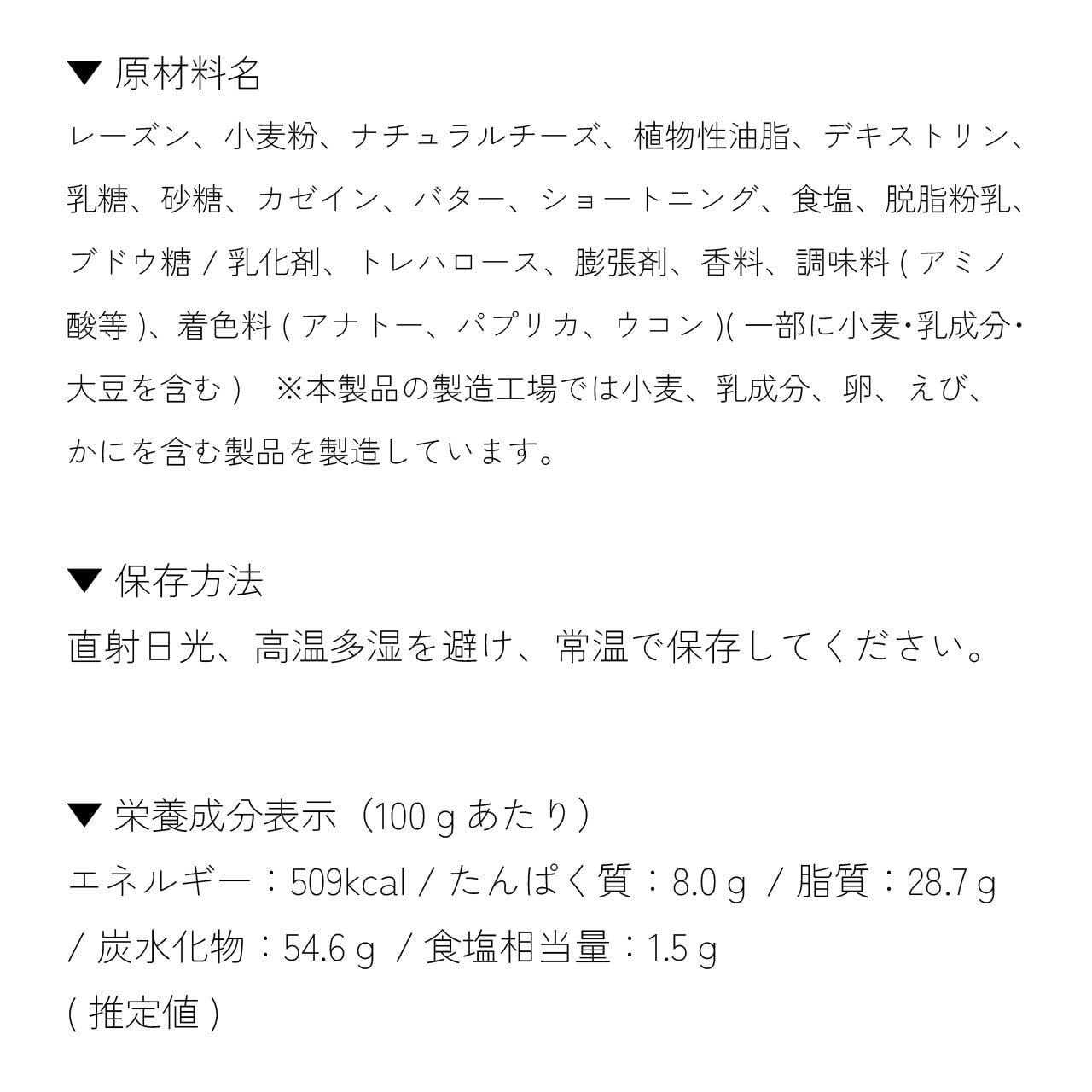 ほんのり塩味を効かせたひと口サイズの軽いクッキーに、濃厚なバターに小粒レーズンの酸味と甘みが程よく混じり合うリッチな味わい。個包装から取り出すだけで簡単にレーズンバタークラッカーが楽しめるひと品。昭和レトロを感じるパッケージとネーミングの通り、長きにわたりロングセラー商品として、喫茶店でコーヒーや紅茶のお共に、スナックやバーではウイスキーやワインに添えられた老舗スナックの定番チャームです。
