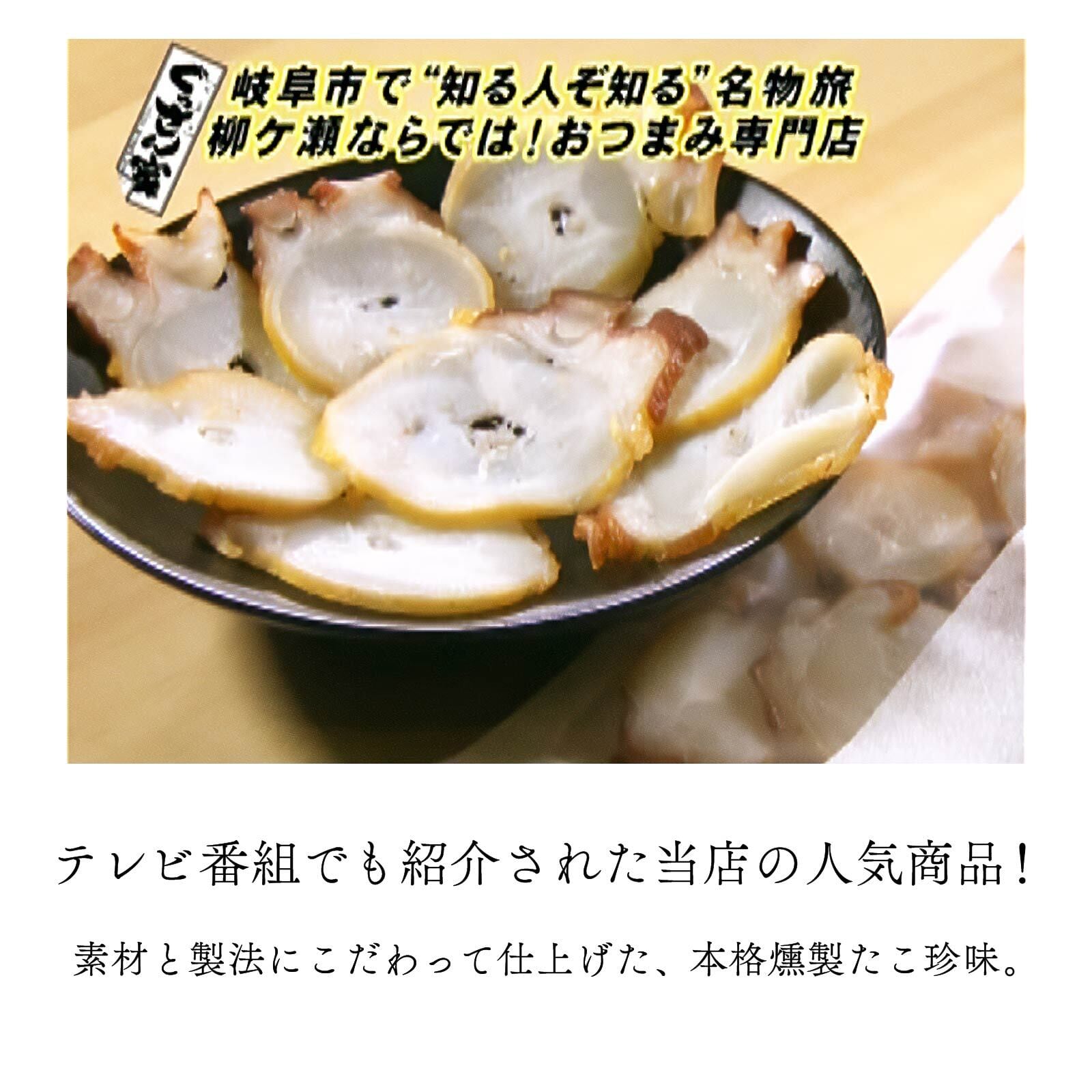 北海道・道東産の大たこの足を使用した燻製珍味。 イカを使ったイミテーション珍味や、燻製液に漬けるだけの“燻製風”とは異なり、 原材料にこだわり、職人が一本一本丁寧に煙で燻し上げた本格派。 鼻孔をくすぐる香ばしい燻製香とタコ本来の旨味が、ほんのりとした甘酢仕立ての味付けと絶妙に調和。 旨味を含んだ水分を適度に残すことで、しなやかな弾力とやわらかさを両立しています。 噛むほどに燻香と旨味が広がり、高級おつまみとしての存在感を放つ逸品です。