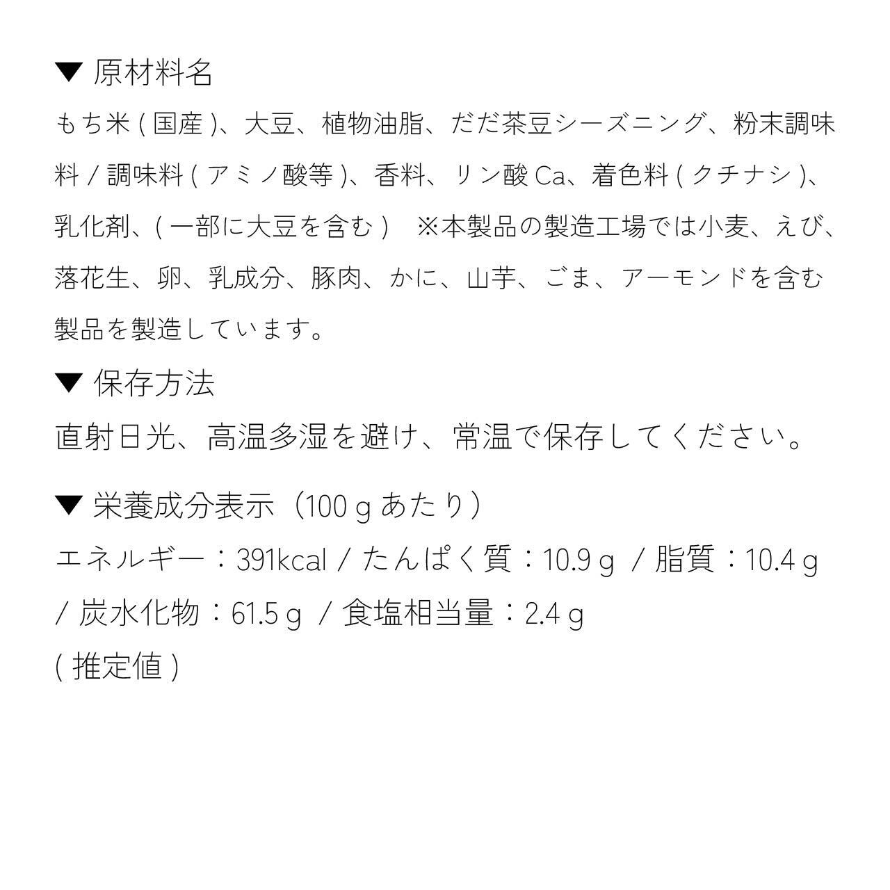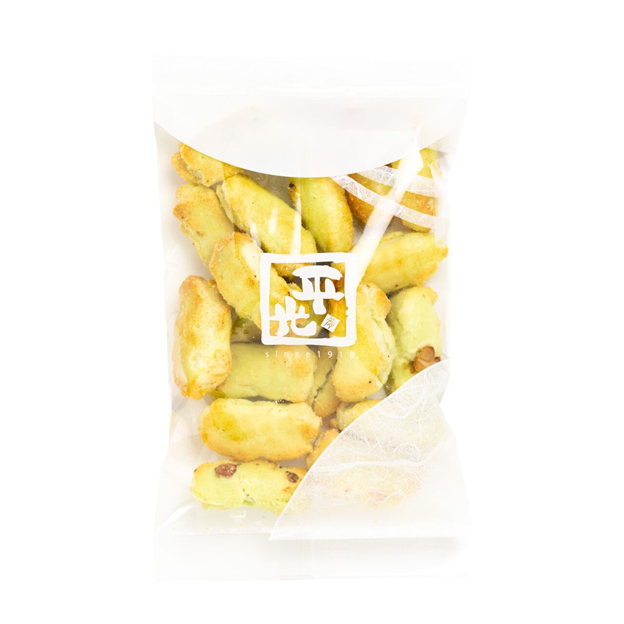枝豆の最高級ブランド「だだちゃ豆」を使用した、お茶請けやビール、日本酒のおつまみにぴったりな高級米菓です!良質な地下水で洗米、浸漬させた国産もち米を使用した生地に、蒸した白大豆と粉末にしただだちゃ豆を練り込んで焼き上げます。仕上げにさらにだだちゃ豆粉末を纏わせて出来上がり。だだちゃ豆の大変濃い枝豆の風味が程好い塩味と相まった美味しさは格別。サクサクと軽い食感が枝豆の香りをさらに引き立てています。カリっと歯応えのある白大豆の香ばしさも良いアクセント。