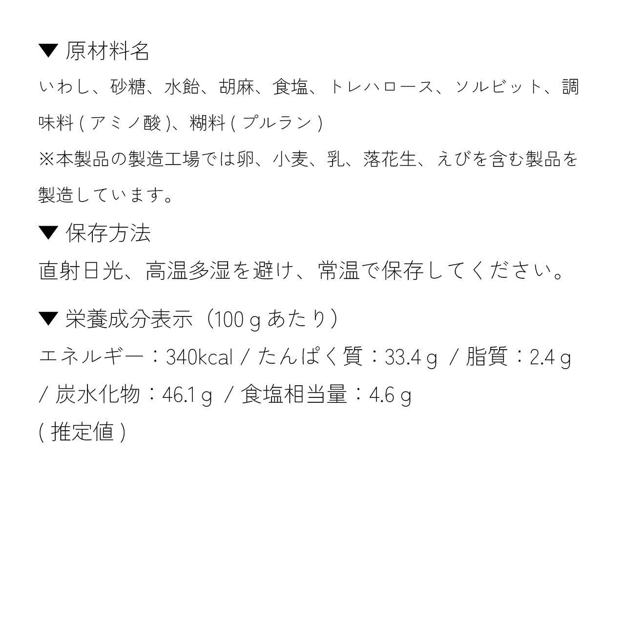 イワシの味醂干しを直火で焙焼。黒胡麻をたっぷりとまぶし、食べやすいスティック状に細くカット。日本酒や焼酎、ビールなどと相性抜群のスティックおつまみです!味醂干しの甘さを含んだ香ばしさに黒胡麻の風味も相まって、ひと袋すぐに食べてしまうと大好評!小骨も気にならない程に柔らかく加工され、手軽にカルシウムも摂取できるので、育ち盛りのお子様のおやつや骨密度が気になるという方にもおすすめです!