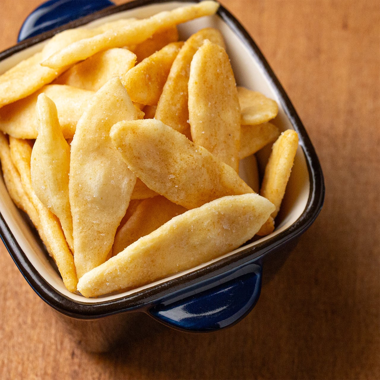 こだわりの国産有塩バターを使用しています!安価品はマーガリン等を使用しますがその香ばしさの違いをお楽しみください。ひと口サイズのカリカリに仕上げた薄焼き生地と相まってお酒が進みます!キンキンに冷えたビールや白ワインと相性抜群!関西圏のバーやスナックなど夜の街では定番のおつまみです。