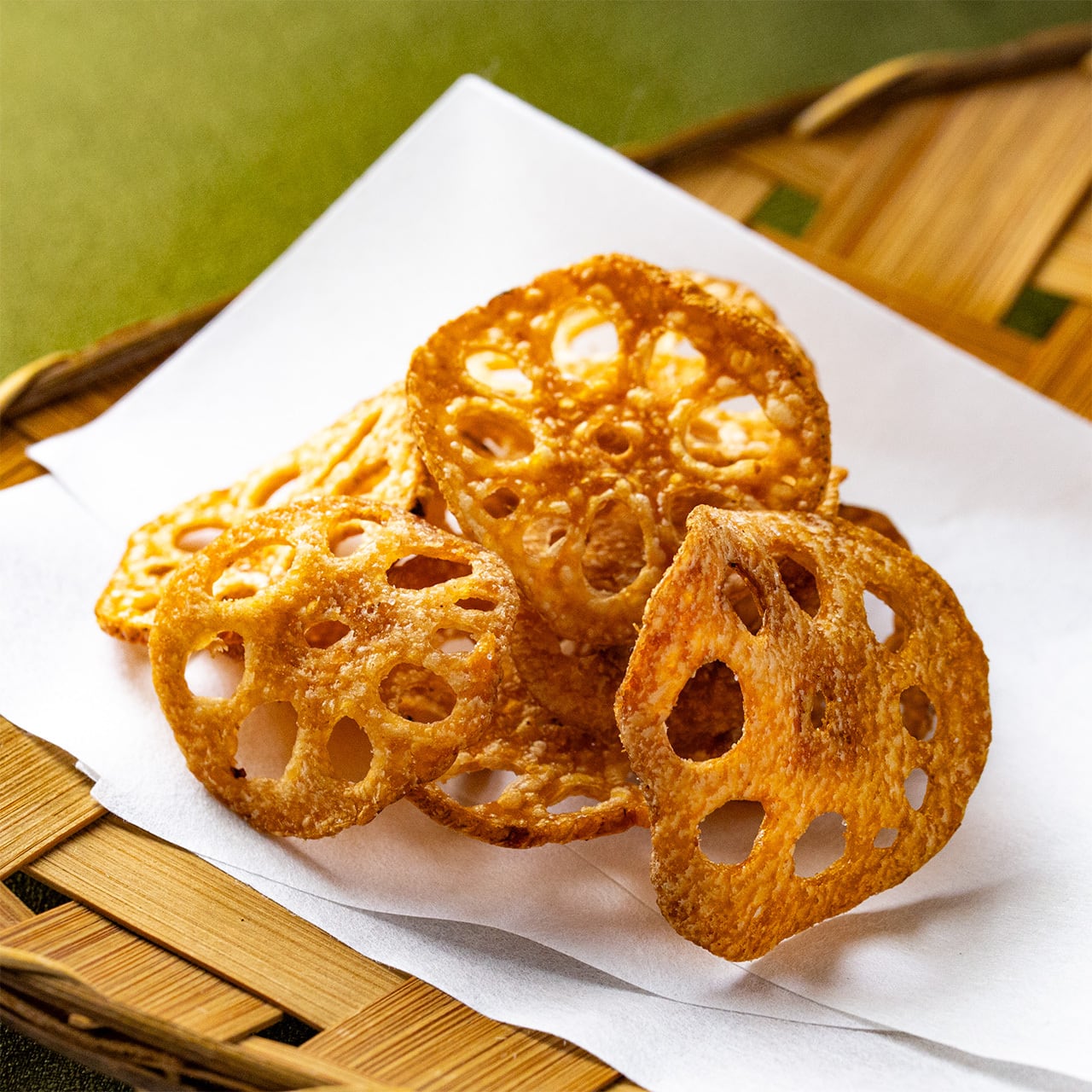 国産の上質なレンコンを真空窯で揚げ、焦がすことなく水分を飛ばし、特有の香ばしさと噛み心地を引き出しました。その仕上がりは懐石料理のあしらいにも利用されるほど上品。揚げに使うのは国産米油。揚がったレンコンに香りを添えています。味付けは鳴門の海から作った国産塩。奥深い味わいが、素材由来の味を引き立てています。硬めの食感をザクッ、ザクッとひと噛み毎に味わう、大人のためのおつまみスナック。ビール、日本酒や焼酎などの和酒によく合い、白ワインやお茶請けにもお勧めです。